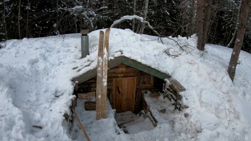 Всё завалило снегом. Расчищаю крышу землянки. Готовлю вкусный ужин. Ночь в -16.