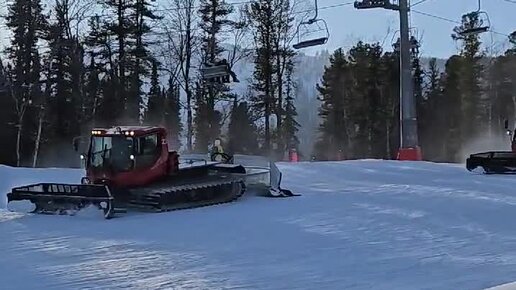 Кемеровская область. Горнолыжный курорт Шерегеш. Подготовка склона ратраками. Февраль 2024 года.