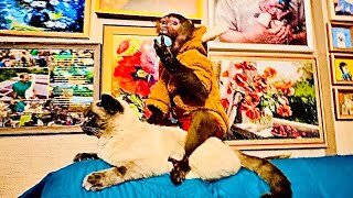 Люська одела новую шубку, оседлала кота Басика и просится гулять на улицу)))