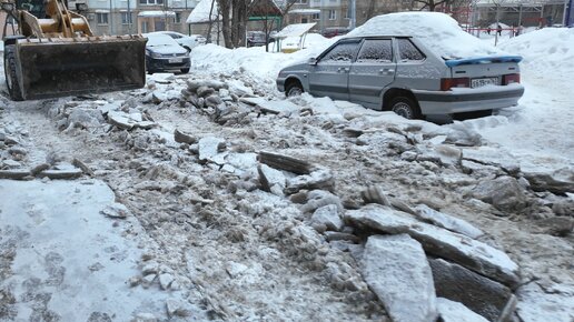 Глыбы льда и вмерзшие автомобили — ликвидация последствий коммунальной аварии во дворах на Чернореченской с помощью тяжелой техники.