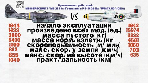 Сравнение истребителей MESSERSCHMITT "ME-262-1а (Германия) и P-51 D-25-NA "MUSTANG" (США)