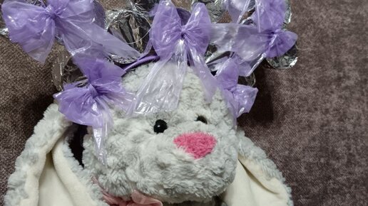 Готовый вариант ободка (шляпы) из втулок и украшения бантиками из полиэтиленовых пакетов