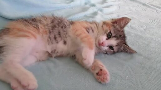 Котёнок лежит на диване, потом кушает корм на кухне.
