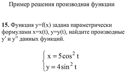 Найдите производные y′ функции заданной параметрически x=5cos^2t, y=4sin^2t пример 15