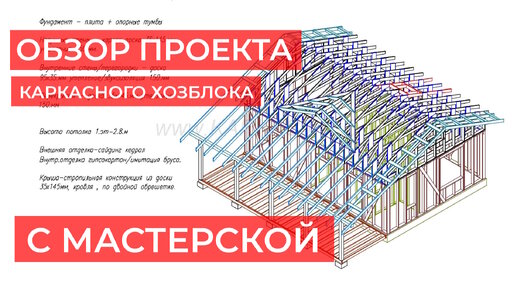 Краткий обзор рабочей документации проекта каркасного хозблока с сауной и мастерской.