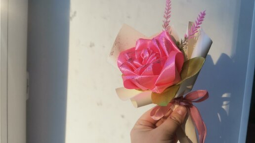 Показываю как упаковать красиво одну розу для подарка на 8 марта. Сделали розу из атласной ленты на подарок девочкам в школе сына