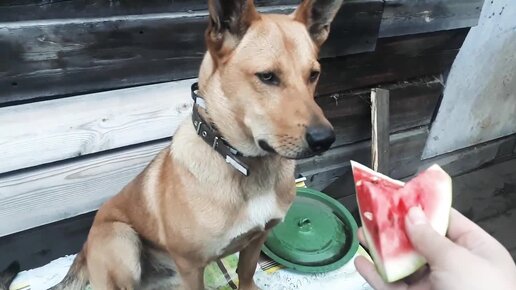 Собака ест арбуз