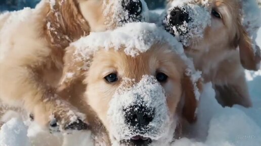 Самое милое видео в мире от нейросети Sora: Золотистые ретриверы в снежных играх