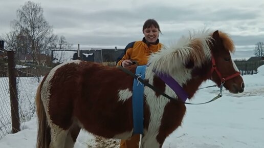 Пони Тоторо в первый раз ходит на вожжах.
