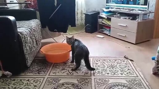 Кошка играет с водой.
