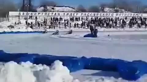 Жёсткие кадры с мотогонок на льду в Уфе. Мотоциклист вылетел под колёса противника во время финального заезда на Кубке России.