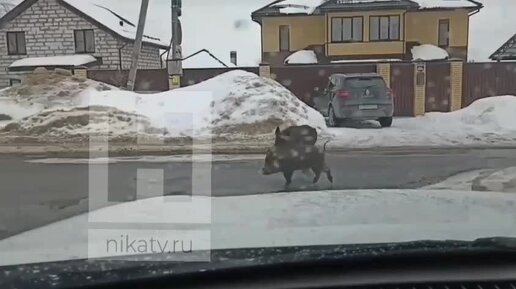 Кабанчики разгуливают по ул.Ермоловской в Калуге. Водитель заснял эту парочку пешеходов, когда она спешила куда-то по своим делам