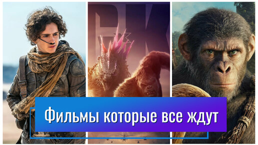 Топ-3 фильма, которые выходит в 2024 году. "Годзилла и Конг: Новая империя", "Планета обезьян: Новое царство", "Дюна: Часть вторая"