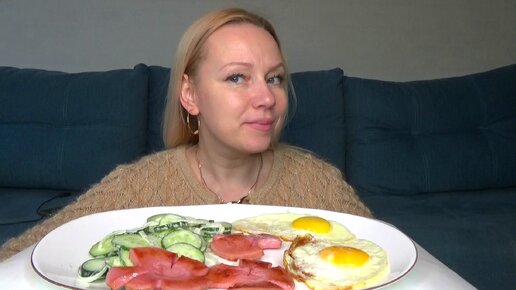 Мукбанг яичница глазунья, колбаса жареная салат с луком и огурцами. Еда.