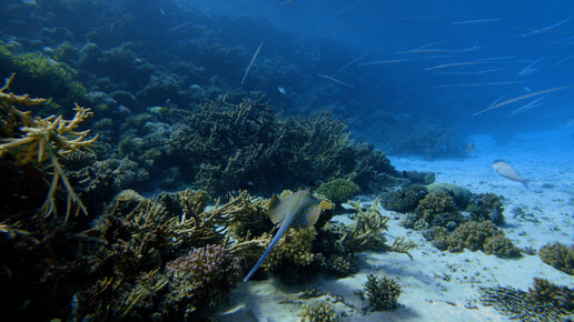 Скат парит в толще воды над коралловым рифом.