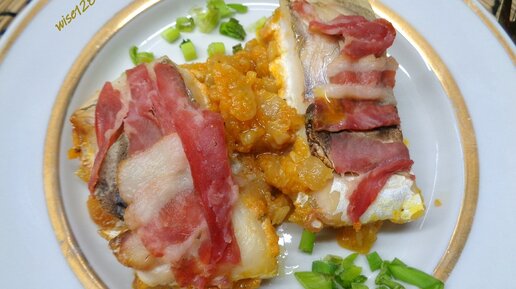 Филе судака, запеченное на овощной подушке, с беконом. Результат приятно удивит.