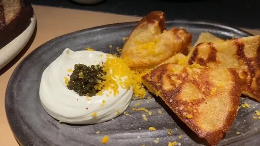 Идея на Масленицу от 0,75 Please – блинчики на масле нуазет с кондитерской сметаной и черной икрой. Баланс сливочного и соленого вкусов