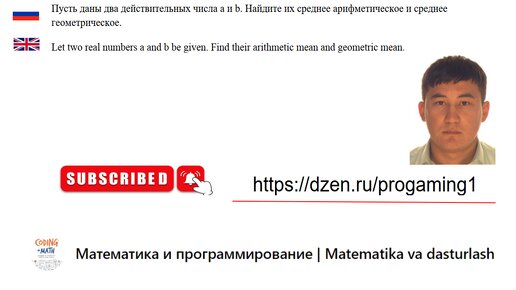 Python 2-dars. Ikkita haqiqiy a va b sonlari berilgan bo´lsin. Ularning o’rta arifmetig va o’rta geometrigini toping #python #top #дзен