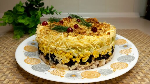 Безподобный слоеный салат к праздничному столус курицей и черносливом. Гости будут в восторге