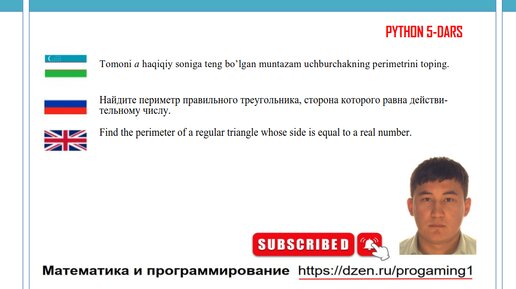 Python 5-dars. Tomoni a haqiqiy soniga teng bo’lgan muntazam uchburchakning perimetrini toping.
