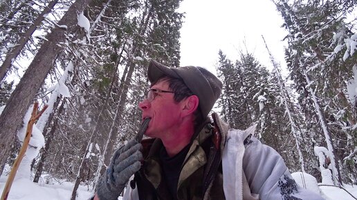 Переночевал в избушке. Иду на лыжах, поднимаю птиц из лунок. Пришлось перейти речку три раза. 4 серия.