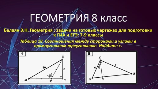 Геометрия 8 класс. Соотношение между сторонами и углами в прямоугольном треугольнике в задачах № 4 и 8