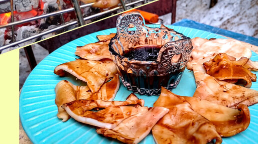 Жаренные кальмары на углях,маринованные в соевом соусе.Вкуснее быть не может.