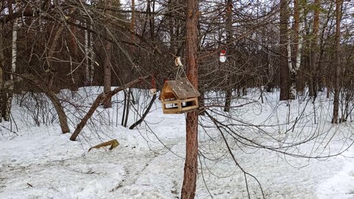Синицы устроили базар у кормушки в лесу