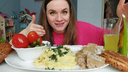 Мукбанг холодец, пюре и маринованные огурчики и помидорки