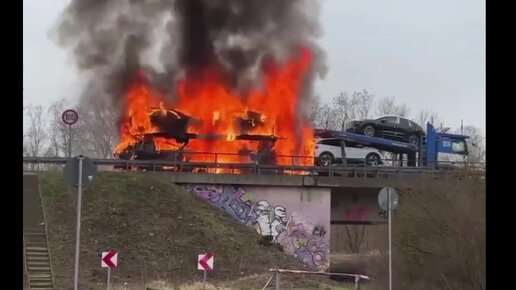 В Германии из-за лопнувшего колеса на автовозе, сгорели 6 электромобилей