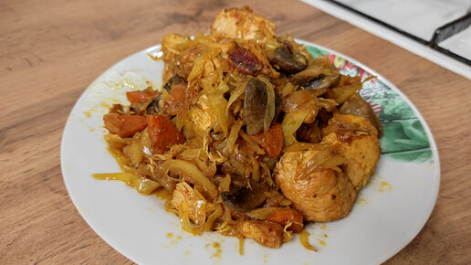 Нежная курица с капустой и грибами.