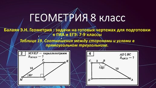 Геометрия 8 класс. Соотношение между сторонами и углами в прямоугольном треугольнике в задачах № 2 и 4 таб.19