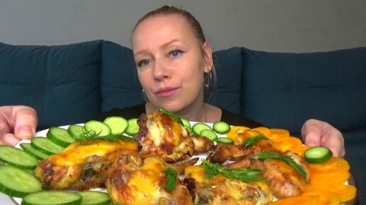 Мукбанг ПП куриные крылышки с сыром в сметанном соусе запеченные в духове, овощи. Еда.