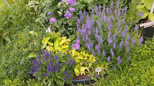 Шалфеи Marcus и Sensation deep blue, мелколепестник Shwazes meer, хоста Lemontini в саду Гриндачи в 2023 году.