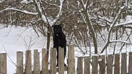 Чей-то чёрный котик сидит на заборе и очевидно ждёт человеческого внимания, ну и пару вкусняшек.