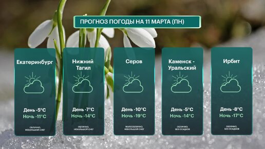 Погода 11 Марта Понедельник в Екатеринбурге, Нижнем Тагиле, Серове, Каменске-Уральском, Ирбите