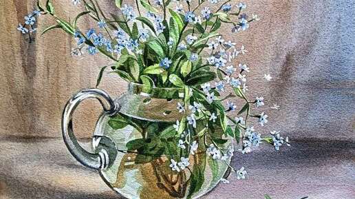 Рисуем незабудки в стеклянном кувшине акварелью.Ускоренное видео