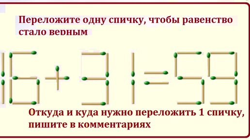 Головоломка с спичками.*** 16 + 31 = 59 .***Исправьте выражение, переложив 1 спичку
