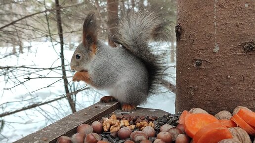 Белка в кормушке ест орехи и следит за всем вокруг