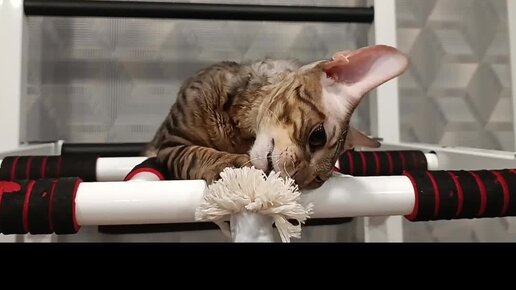 Игры котика корниш-рекс с канатом на турнике
