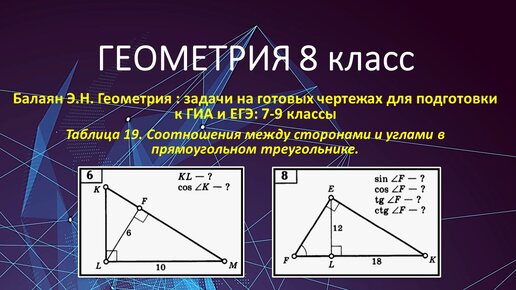 Геометрия 8 класс. Соотношение между сторонами и углами в прямоугольном треугольнике в задачах _№ 6 и 8 на готовых чертежах.