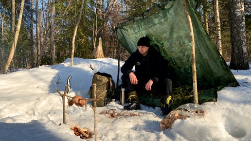 Построил быстрое укрытие от ветра в весенним лесу. Жарю мясо индейки большим куском на костре!!!