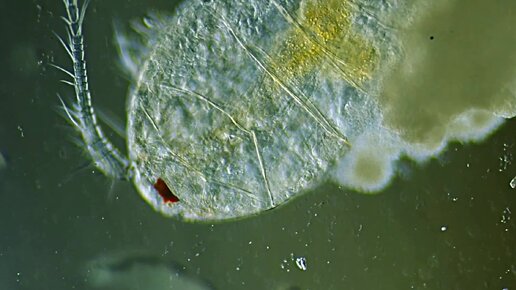 Одноглазый Циклоп под микроскопом сидит в окружении своей выкладки яиц