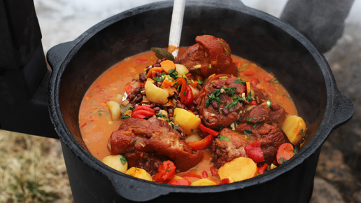 Деревенский суп из свиных рулек в казане на костре.