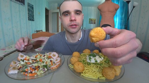 МУКБАНГ МЯСО КАРБОНАД / СПАГЕТТИ / КРУГГЕТСЫ - ГОРЯЧАЯ ШТУЧКА / САЛАТ / EATING Mukbang ASMR АСМР
