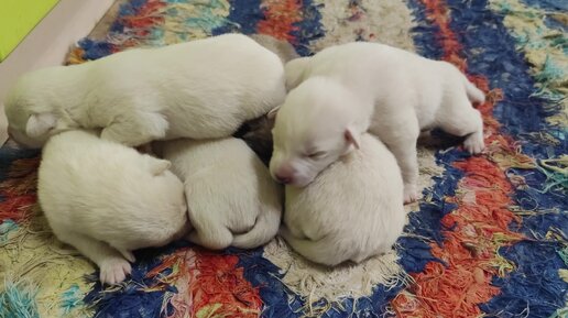 Маленькие щенята мило спят и пищат. Собачка родила шестеро щенят