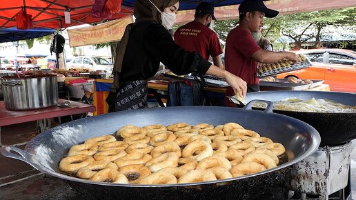 Приготовление уличных пончиков в гигантском горшке - малайзийская еда