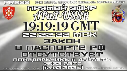 ЭФИР АРиЯ📺Понедельник 11 Дайлет 7532 лето от С.М.З.Х [13.03.2024] ⛔️ЗАКОН О ПАСПОРТЕ РФ ОТСУТСТВУЕТ