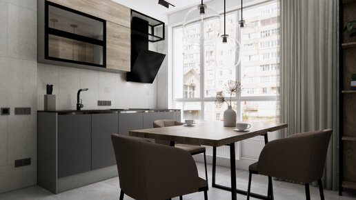 Гармония серых тонов, белого, графита и тона дерева в дизайне кухни, прихожей и санузлов