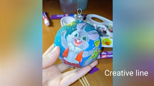Роспись шара на новогоднюю ёлку. Заяц с советской открытки.